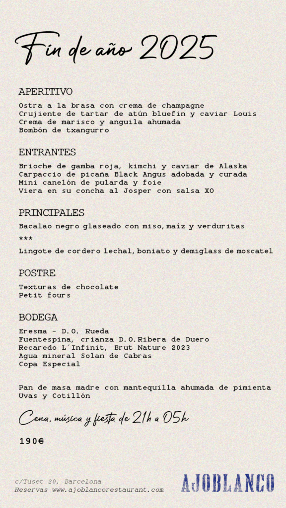 ¡2026 empiézalo en el Ajo Tenemos preparada una Nochevieja memorable. Una propuesta gastronómica completa, cuidada al detalle y pensada para celebrar por todo lo alto. Incluye una selección de vinos y cava, una copa, uvas de la suerte y cotillón.