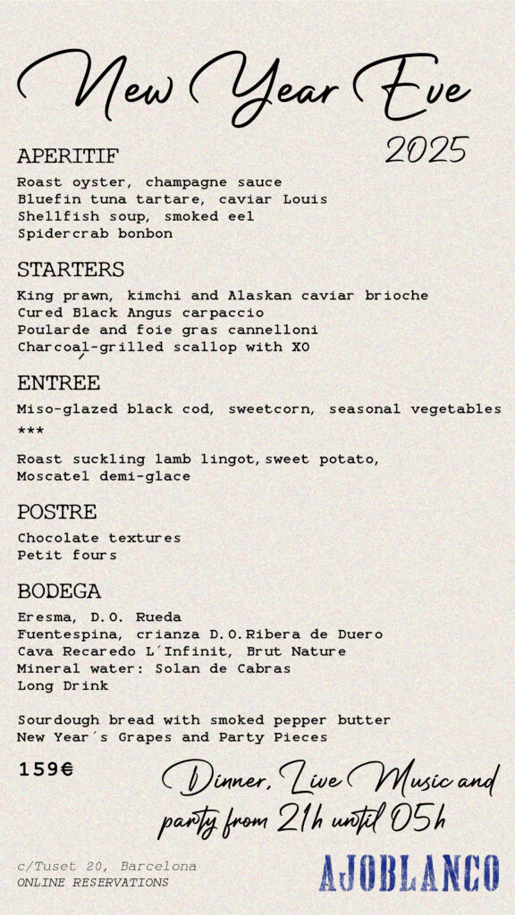 We have prepared a truly memorable New Year’s Eve celebration for you. A complete gastronomic experience, carefully crafted down to the last detail and designed to celebrate in style. The evening includes a selection of wines and cava, one drink, the traditional lucky grapes, and festive party accessories.